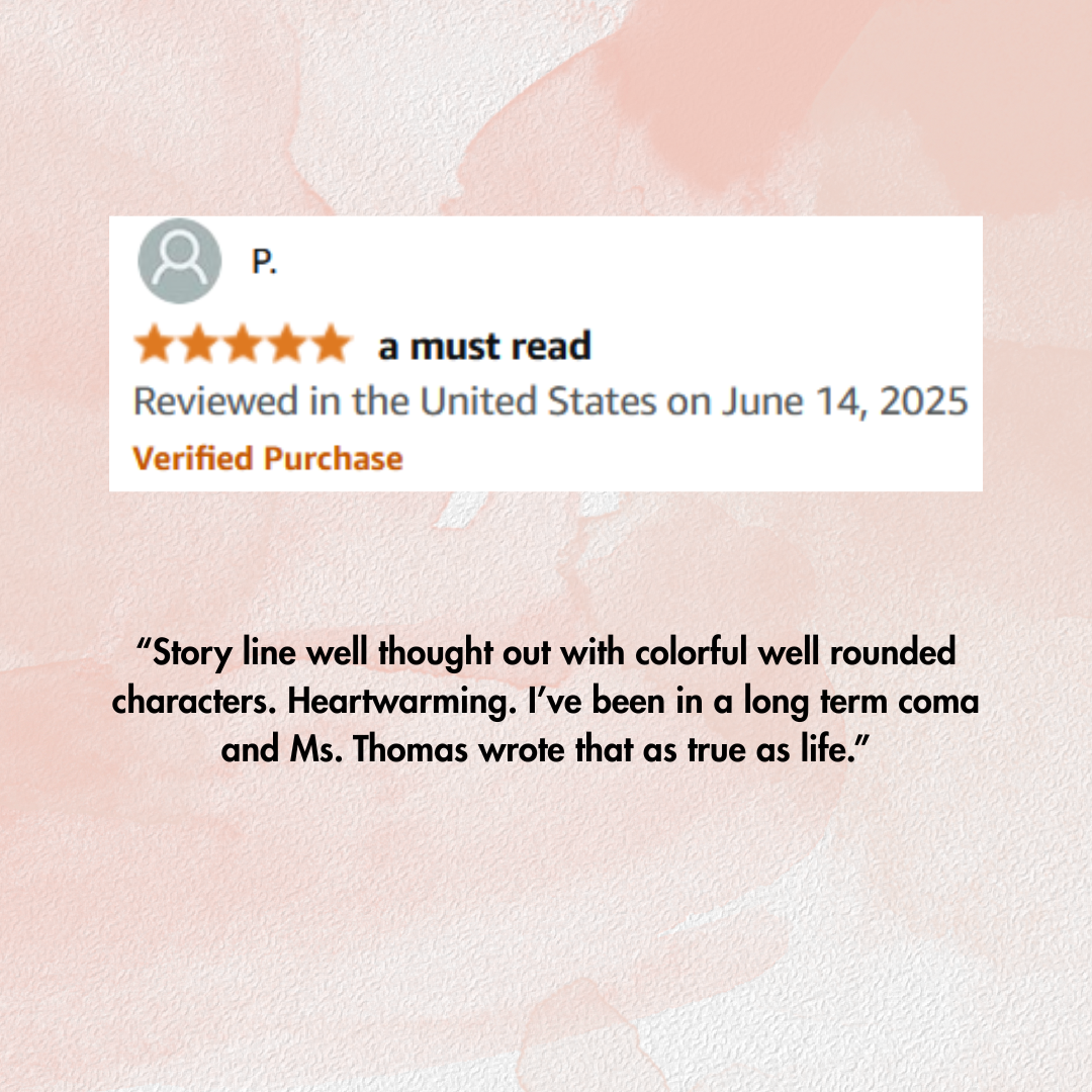 ⭐⭐⭐⭐⭐ “Story line well thought out with colorful well rounded characters. Heartwarming. I’ve been in a long term coma and Ms. Thomas wrote that as true as life.” - Amazon Reviewer